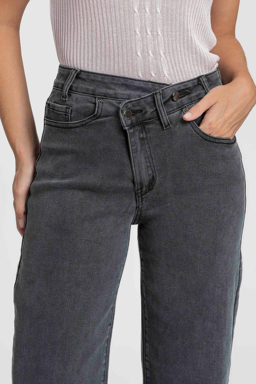 Daniela Straight Cut Asymmetric Button Detail Jeans in Black